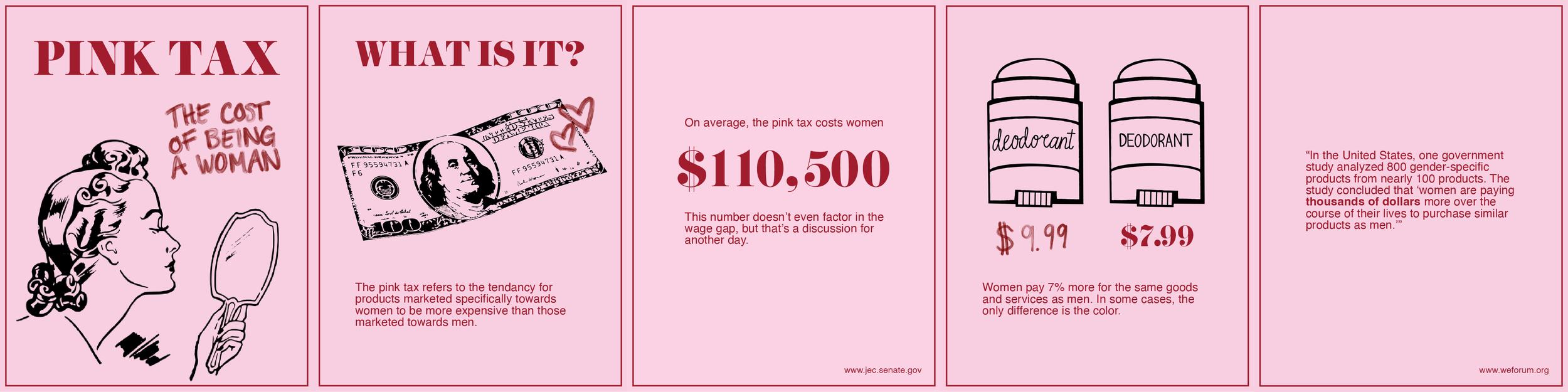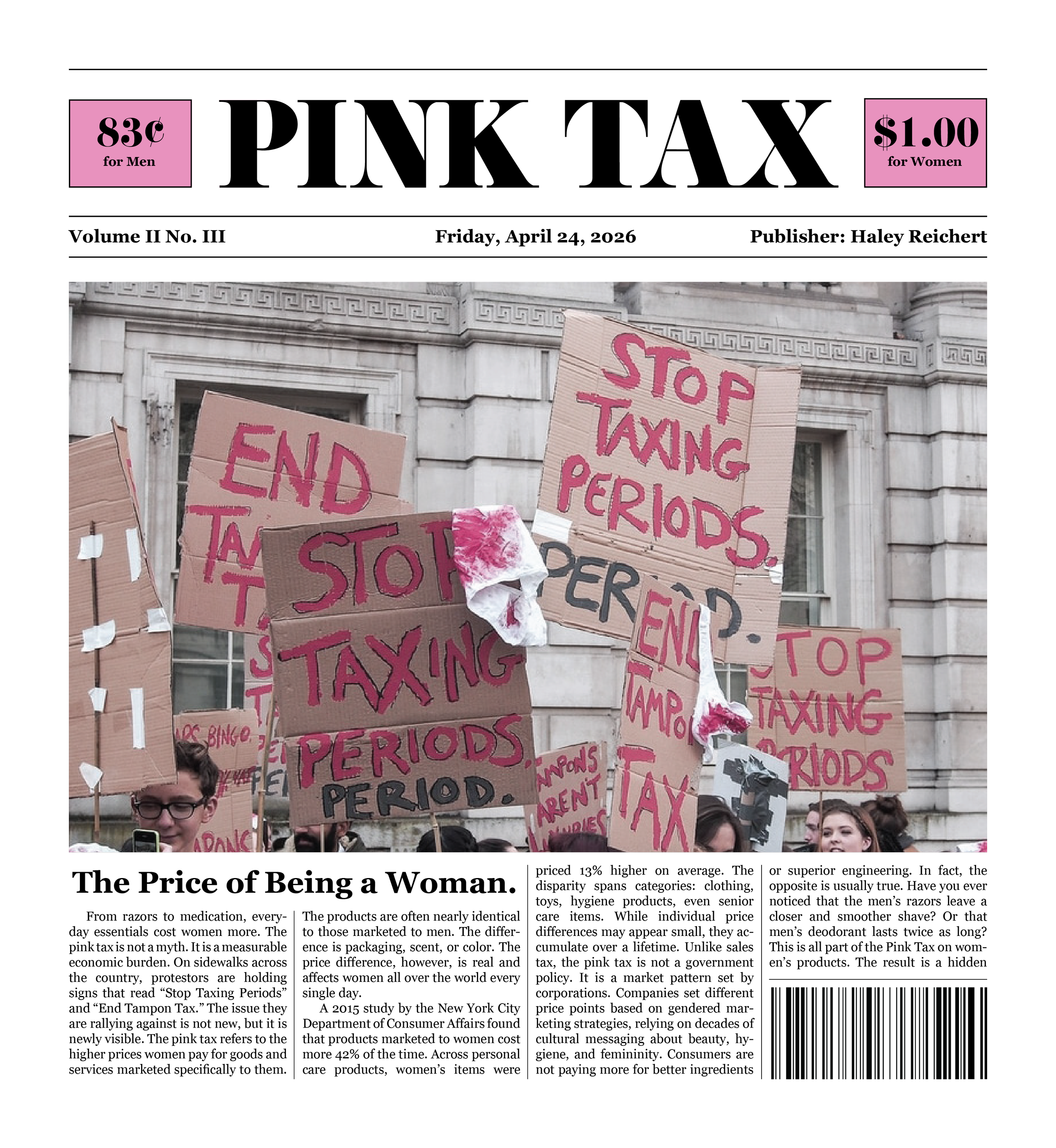 The Pink Tax is the extra cost women often pay for products and services that are nearly identical to those marketed toward men. This project began in my Typography I class, where I created a series of Instagram posts to highlight how this pricing disparity shows up in everyday life. I later developed the work into a full public service campaign, extending it into a newspaper layout and printed flyers designed to reach audiences beyond Instagram and encourage wider awareness of the issue.