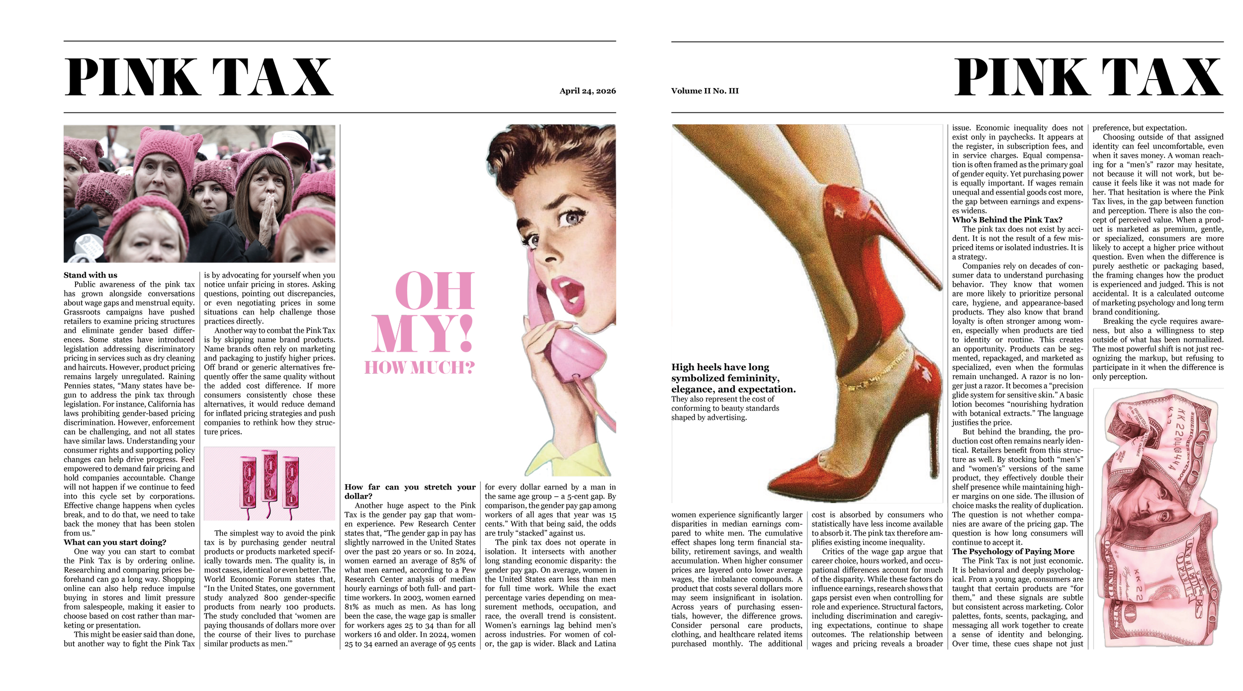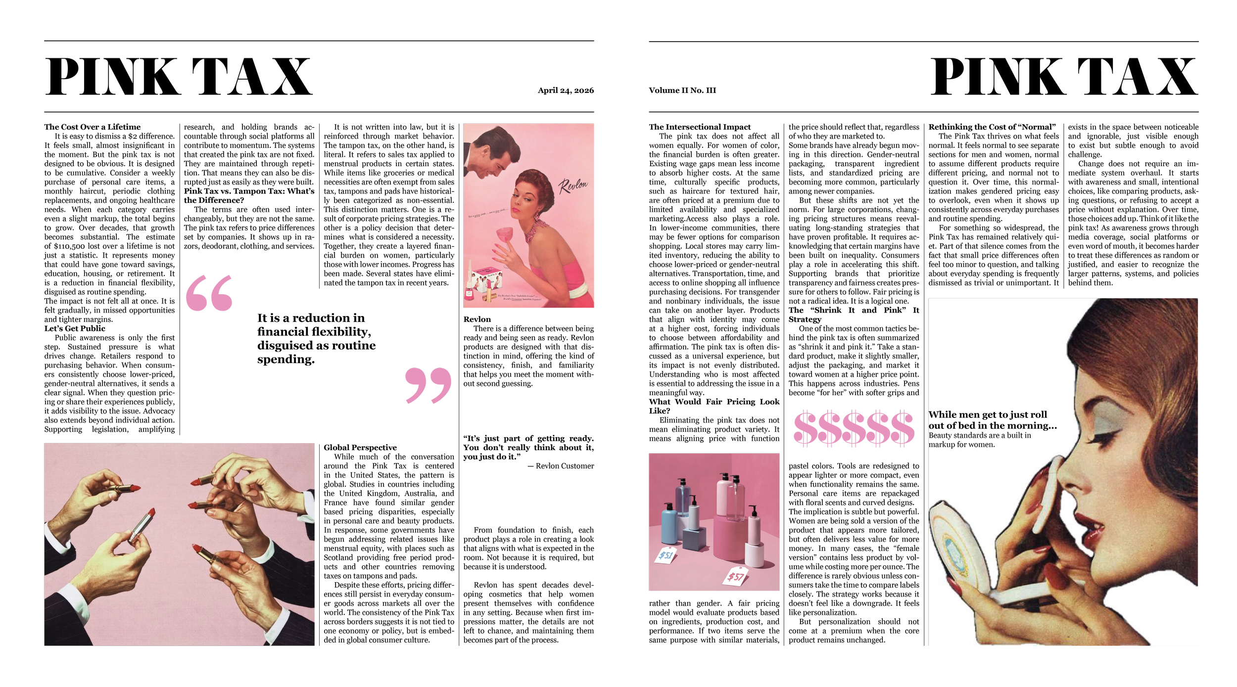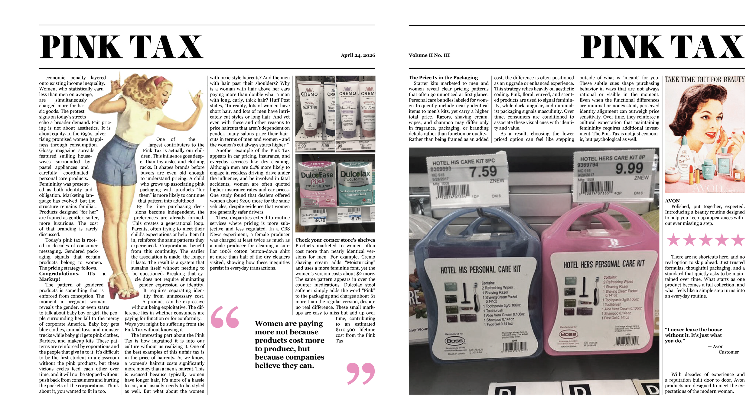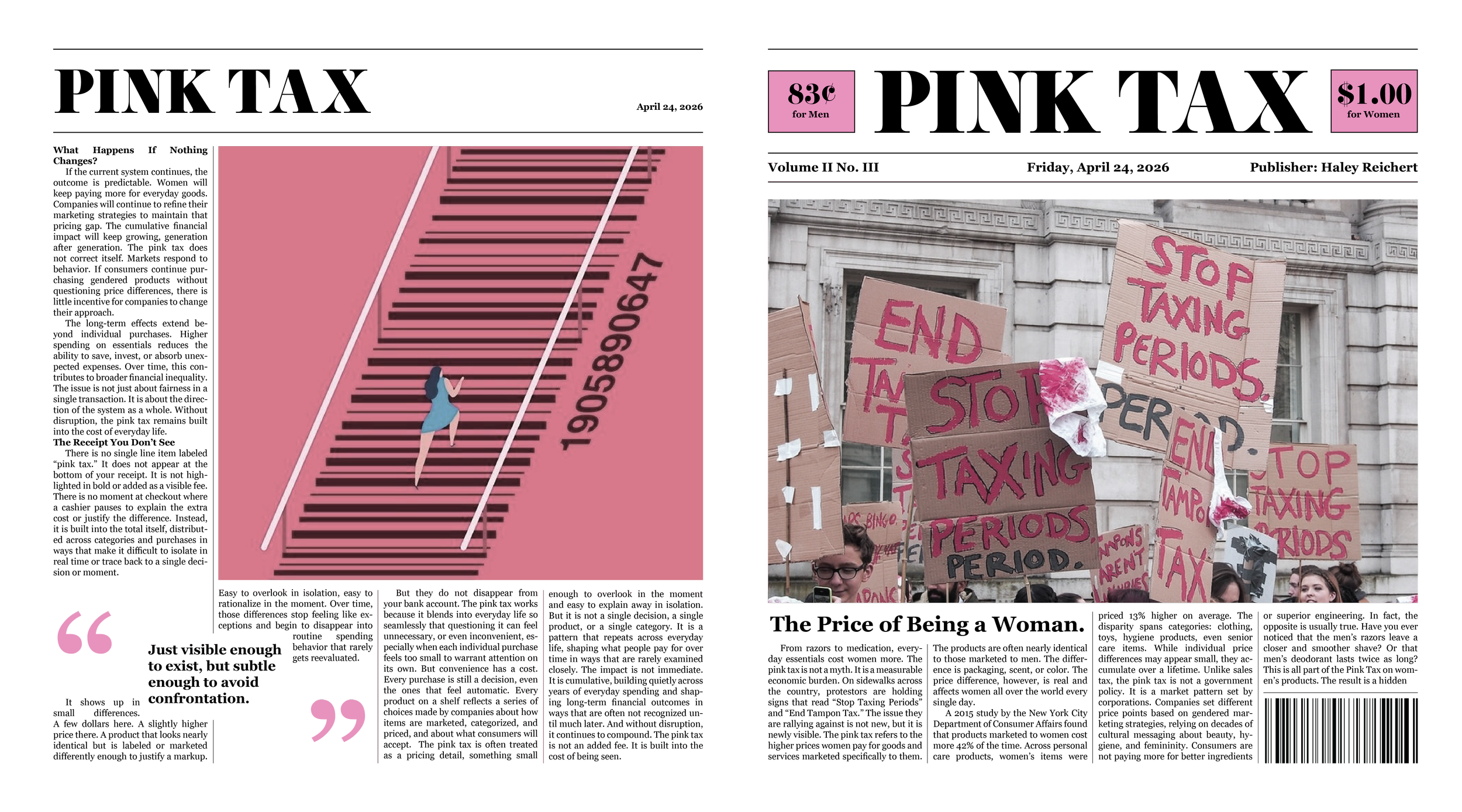 Created in Adobe InDesign, this newspaper spreads the Pink Tax campaign into a print-based editorial experience. The layout uses typographic structure and visual hierarchy to communicate the impact of gender-based pricing in a more in-depth, accessible way.