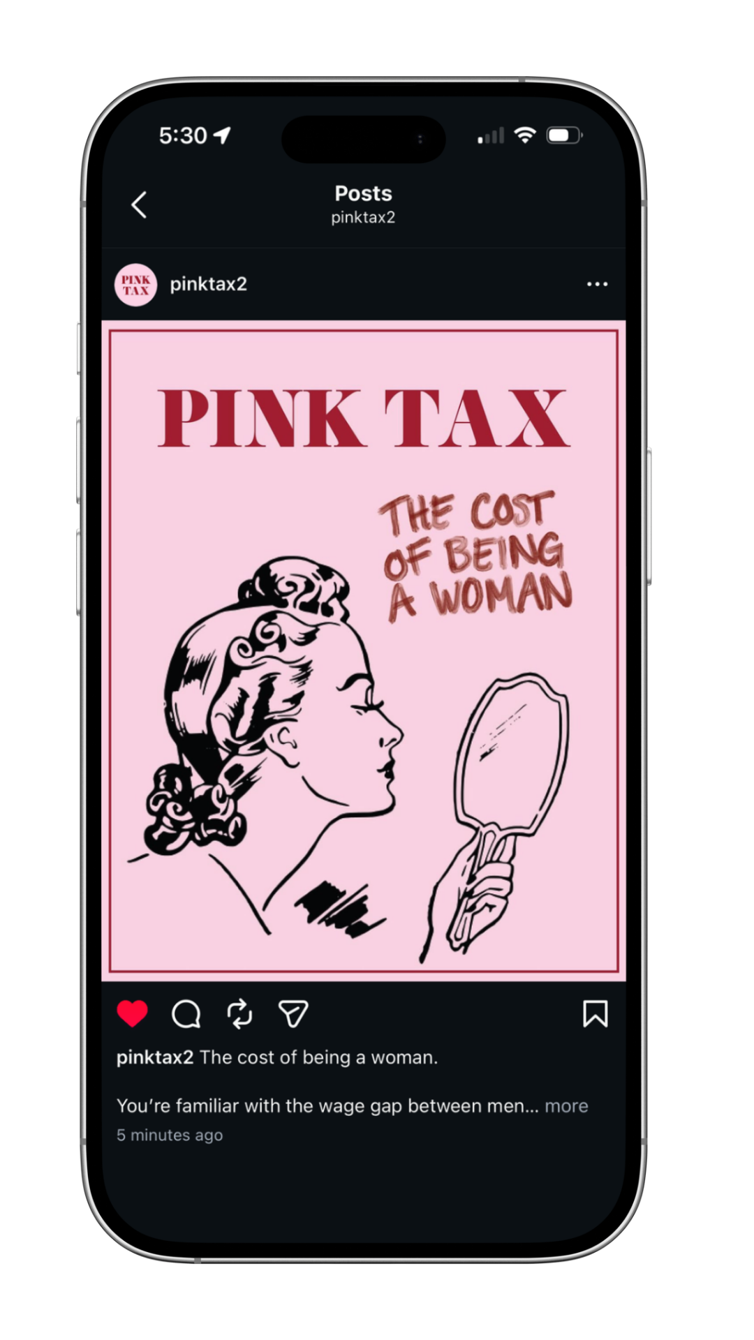 Designed for Instagram, this three-part carousel series breaks down the Pink Tax through progressive storytelling. The first post builds awareness, the second reveals subtle ways the Pink Tax appears in daily spending, and the third provides actionable strategies for combating it.
