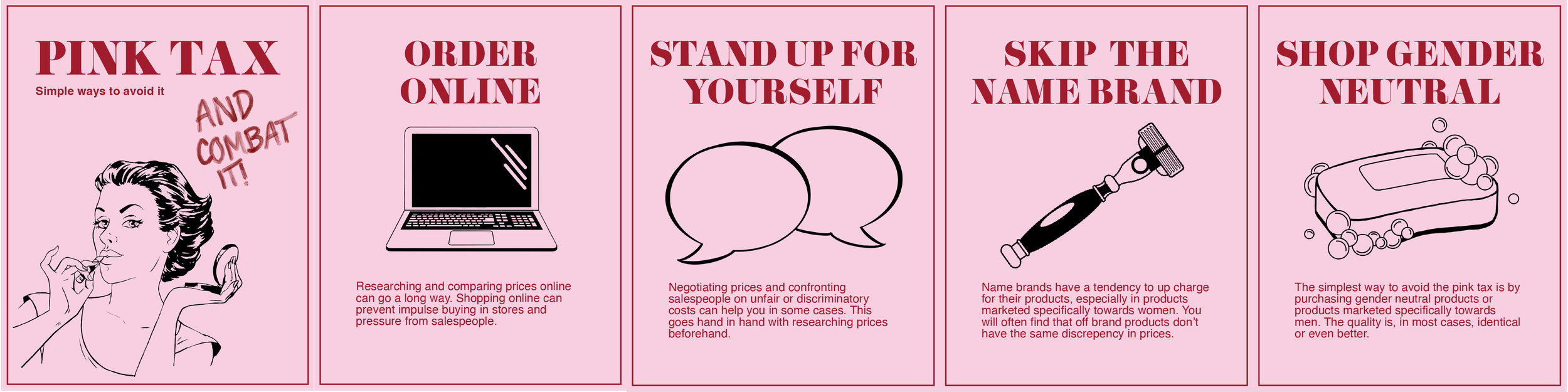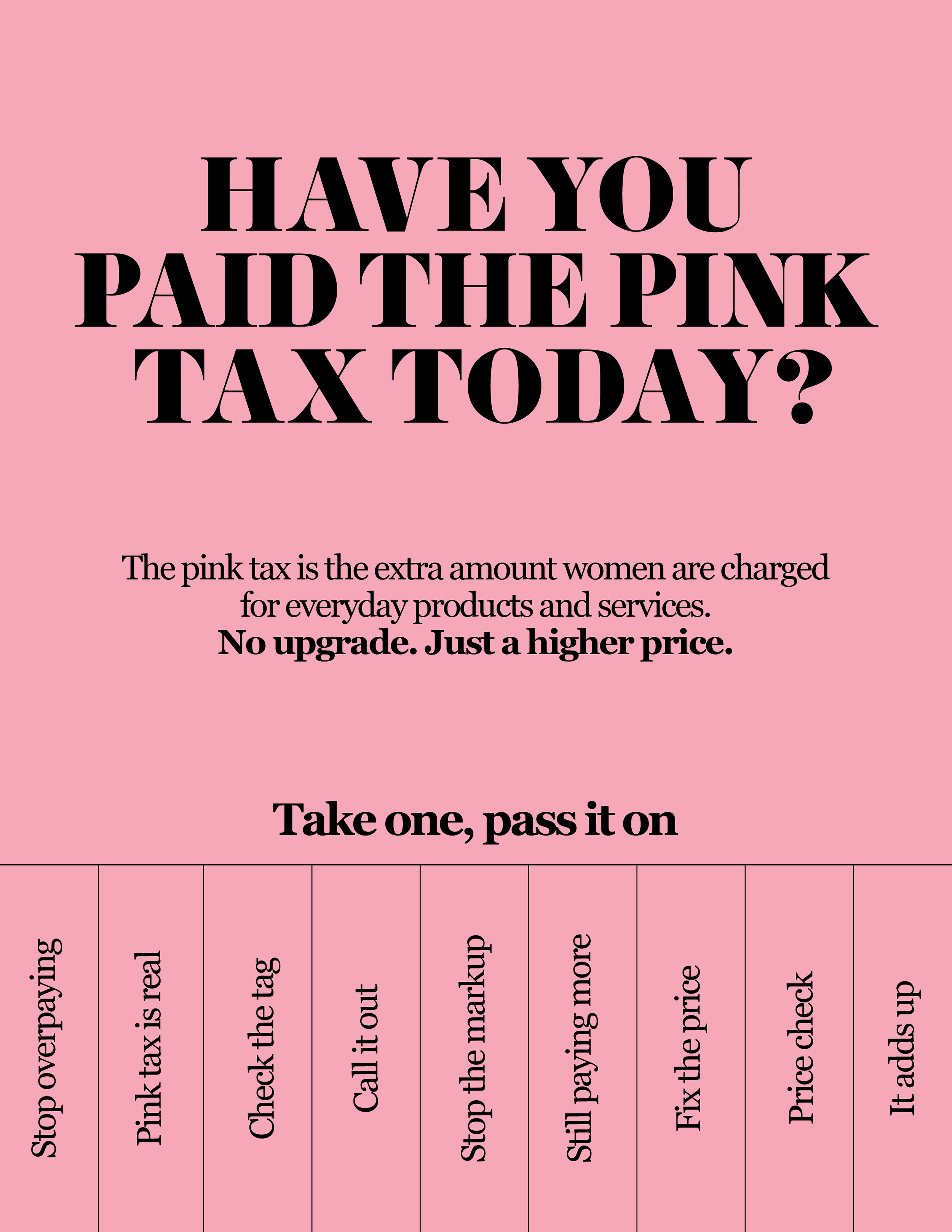 These flyers were designed to raise awareness of the Pink Tax through bold, eye-catching visuals and a strong use of pink to immediately signal the theme and draw attention in public spaces.